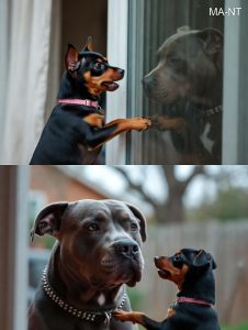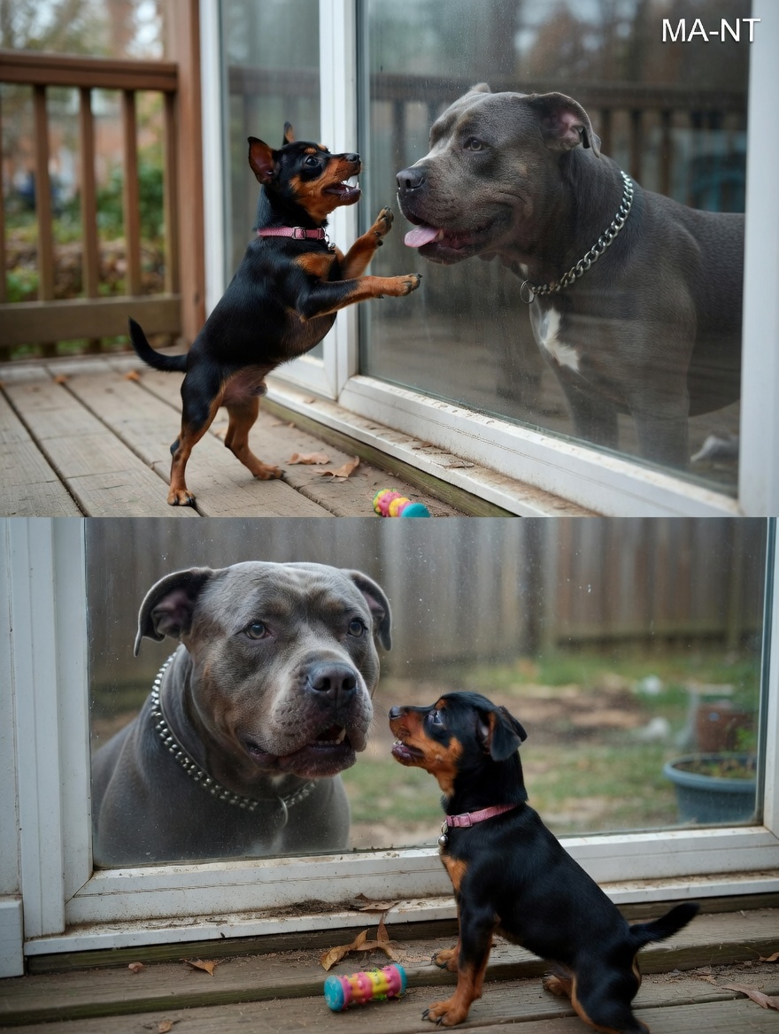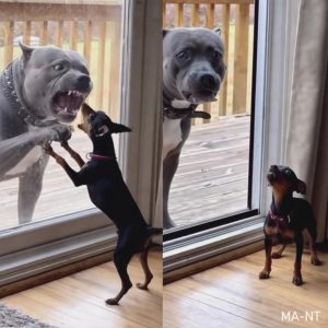 When the small dog stands inside the house and the neighbor’s dog approaches from outside, the mood instantly shifts. The small dog jumps up against the glass, barking and growling as if it is bravely defending the entire house. On the other side, the bigger dog presses close to the door and responds with its own deep growls, almost as if it has accepted a challenge.