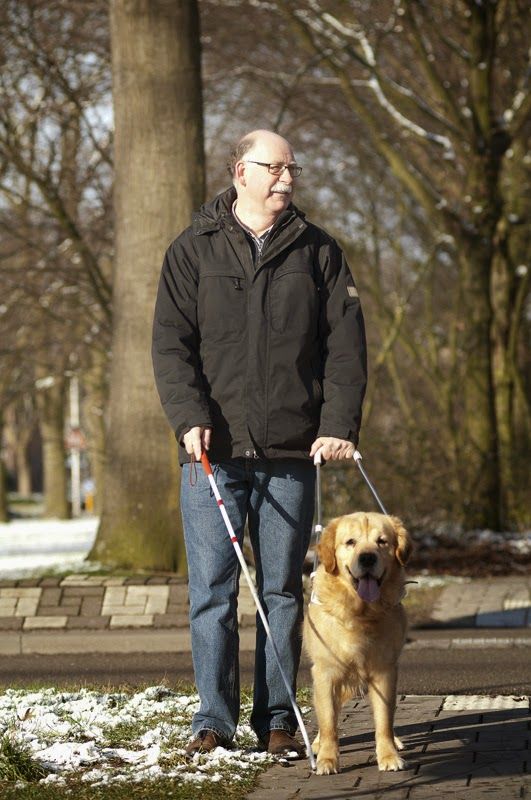 The man cannot see the path ahead, the changing light through the trees, or the patches of snow scattered along the ground. But his dog can. And that makes all the difference.