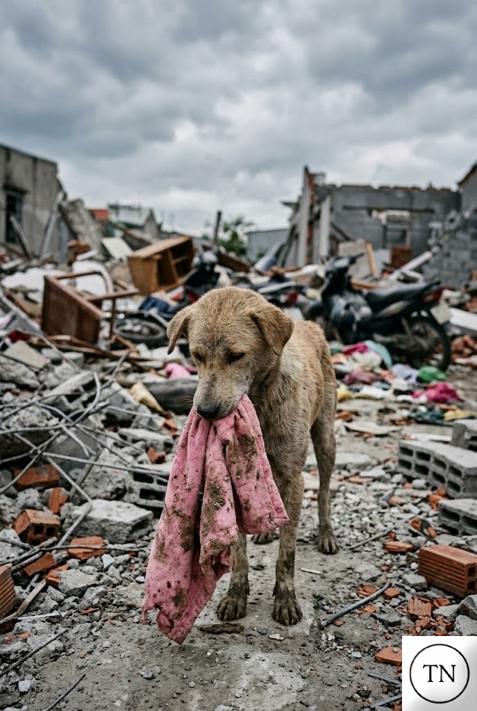 Even surrounded by destruction, the dog refuses to abandon it. He lies on top of the blanket, as if keeping it warm, as though the familiar scent is the only comfort left in a world that has suddenly disappeared.