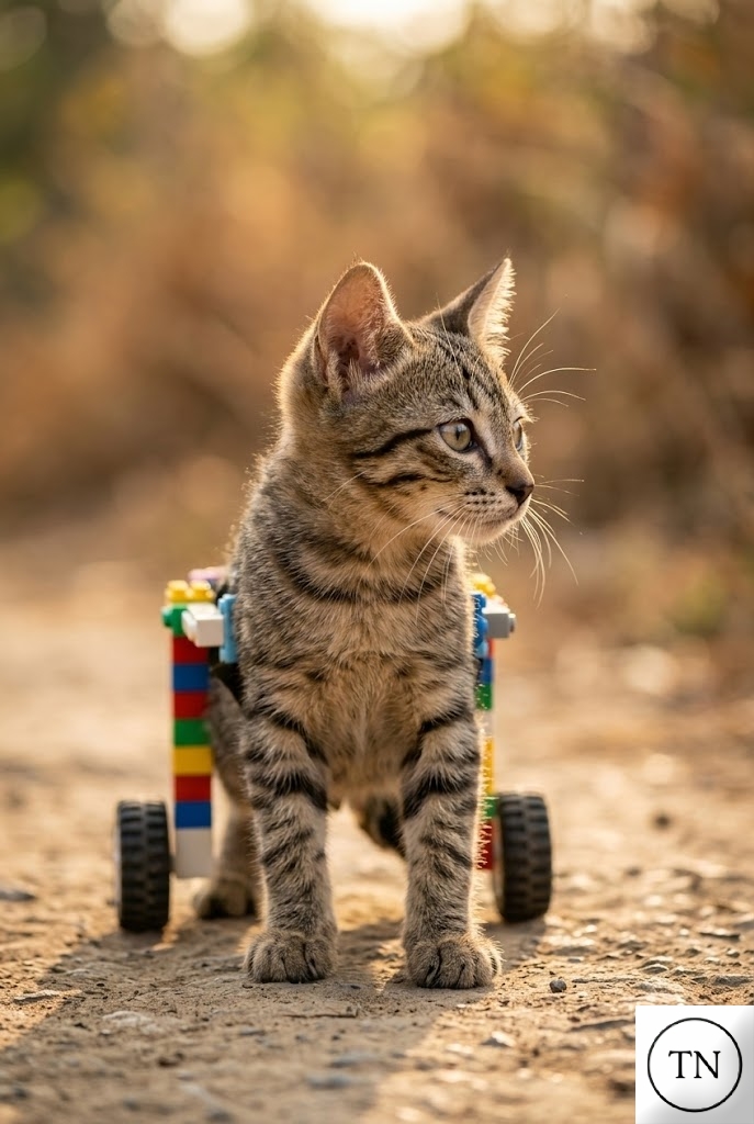 Using wheels from a broken toy truck and pieces of old Lego blocks, the child carefully built a tiny wheelchair for the injured kitten. To make sure it wouldn’t hurt the animal’s scraped belly, he gently tied the structure together with soft fabric strips, creating a simple but thoughtful design.