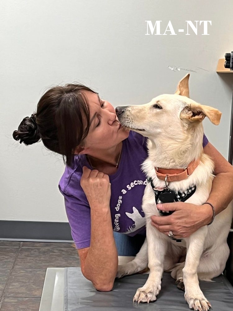 The woman in the image appears to be a veterinary worker or animal rescue volunteer. Her purple shirt suggests involvement in a mission focused on giving dogs a “second chance,” a phrase commonly associated with rescue organizations that rehabilitate and rehome animals in need.