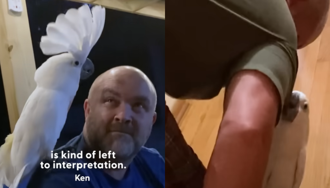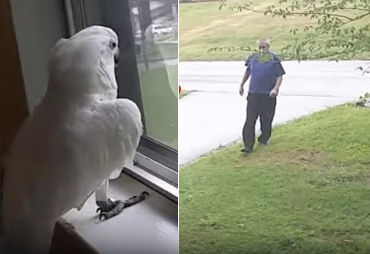 The scene begins quietly inside a home as the cockatoo sits near the window, casually observing the outside world. Then suddenly, something catches his attention.
