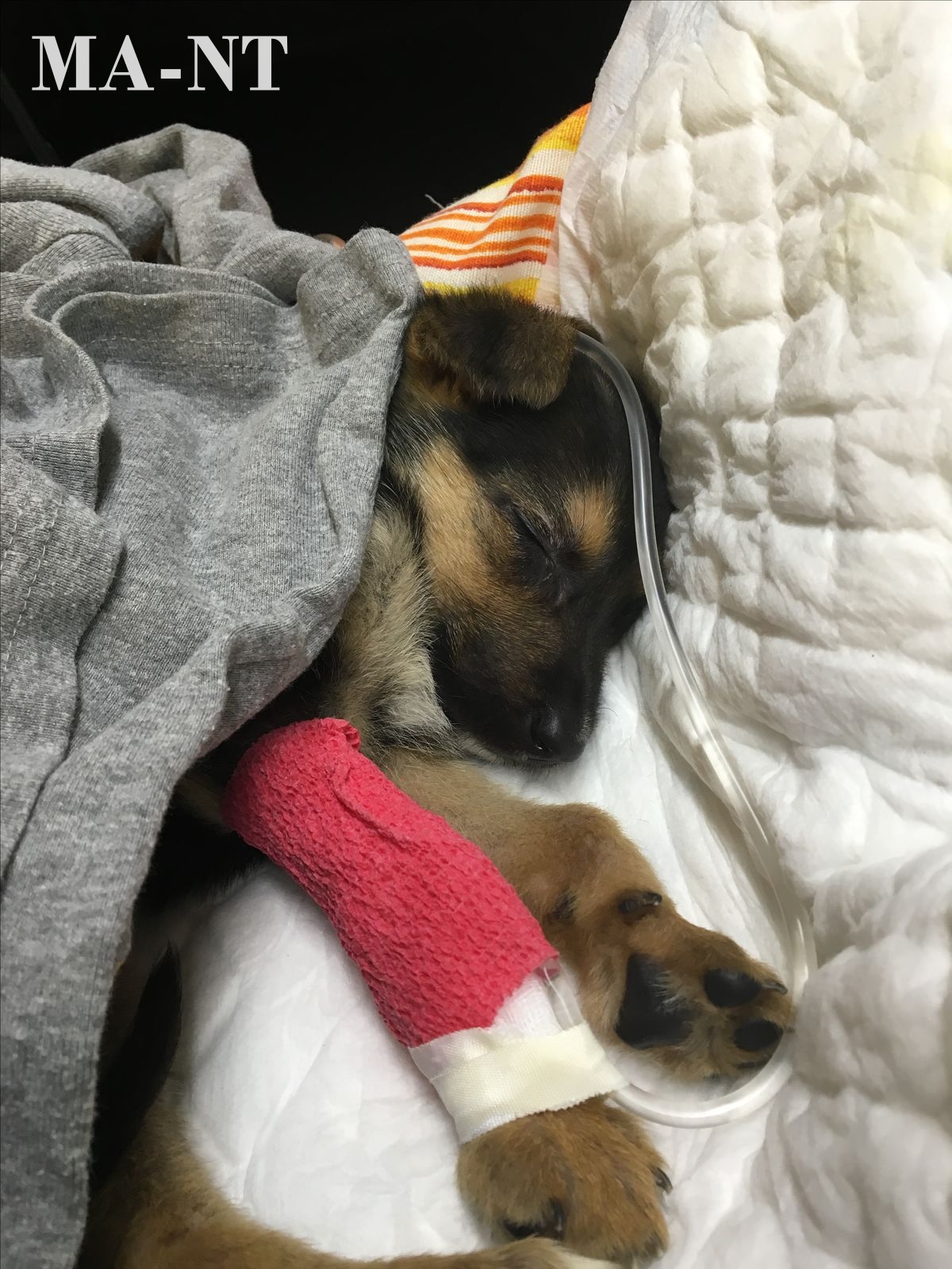 The young dog lies peacefully on a soft blanket while recovering from a medical procedure or illness. One of its front legs is wrapped in a bright pink bandage that appears to protect an intravenous catheter used for delivering fluids or medication. A clear medical tube runs beside the puppy, indicating that supportive treatment is currently in place.
