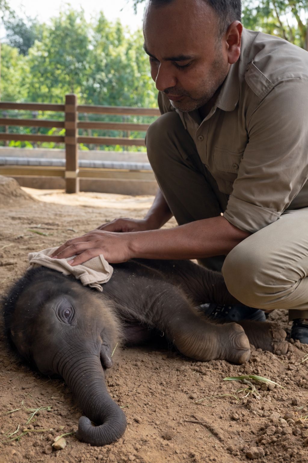 Kneeling beside the calf, the caretaker gently uses a soft cloth to clean its head. One hand wipes carefully while the other stays steady, making sure the little elephant feels safe and comfortable. The movements are slow and patient, showing the kind of care that comes from experience and compassion. 🌿