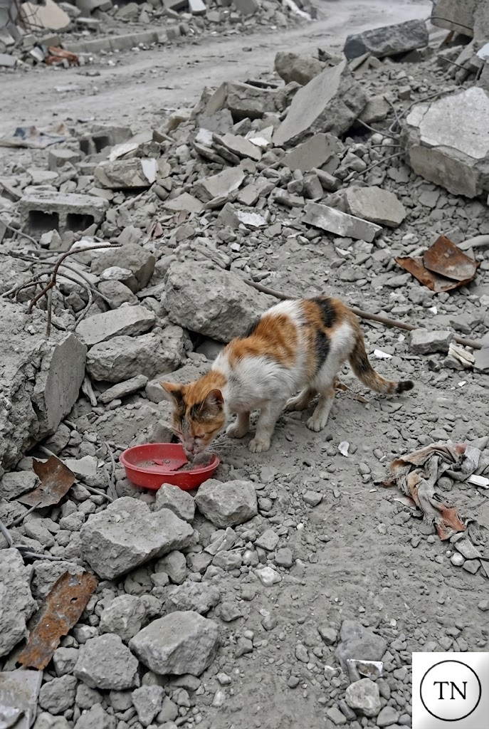 A tiny kitten was seen wandering through piles of rubble, carefully stepping over broken stones as if searching for something familiar. After a few moments, she stopped at a small spot between the debris and began pawing gently at the ground.