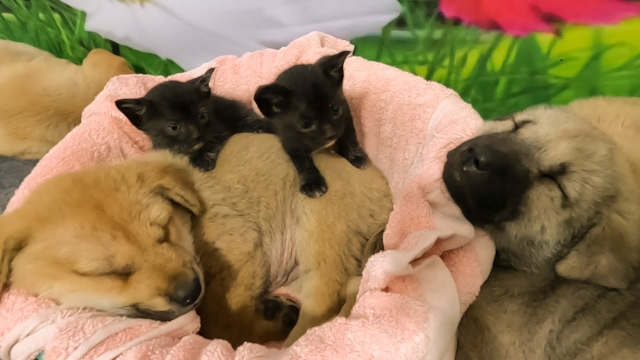 Heartwarming Friendship: Puppies and Kittens Eat and Sleep Together