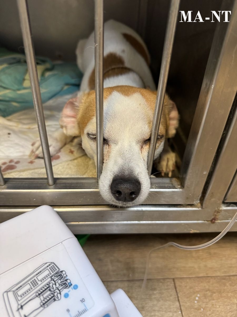 Bella, a small brown-and-white dog, is currently receiving intensive care in an animal hospital. Captured resting her head on the metal bars of her cage, Bella appears exhausted but determined, a testament to the resilience many animals show in the face of medical challenges.