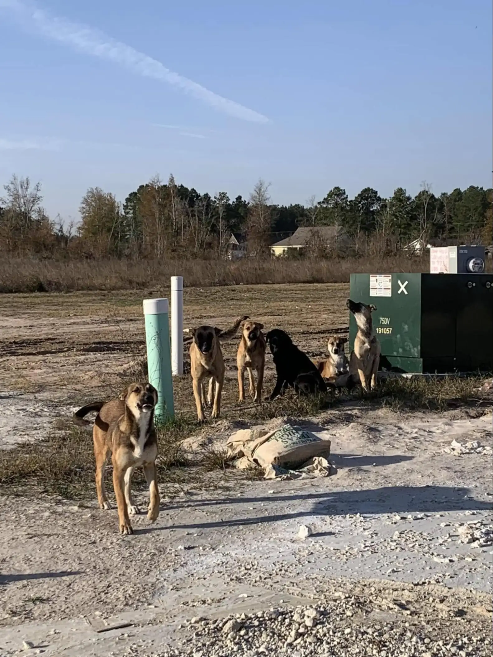 In a quiet, dusty clearing far from the busy sounds of the city, a small group of dogs gathered together near an abandoned patch of land. The area looked unfinished—scattered gravel, dry soil, and a few utility boxes standing alone under the open sky. In the distance, trees and a few houses could be seen, but here, the space felt strangely empty. Yet six dogs had chosen this place as their meeting point.
