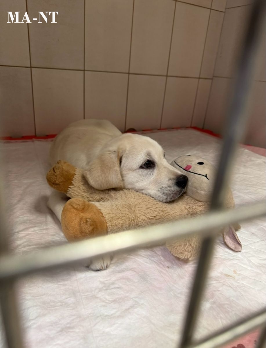 Luna, a small white puppy with soft, expressive eyes, has recently been admitted to a shelter for care and recovery. In photographs, she is seen resting her head on a stuffed animal, a gentle companion that offers her comfort and a sense of security in an otherwise unfamiliar environment.