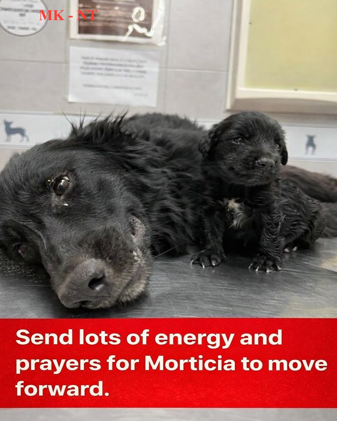 In a quiet veterinary clinic, a black mother dog named Morticia lies weak and exhausted on a cold examination table. 🐶🖤