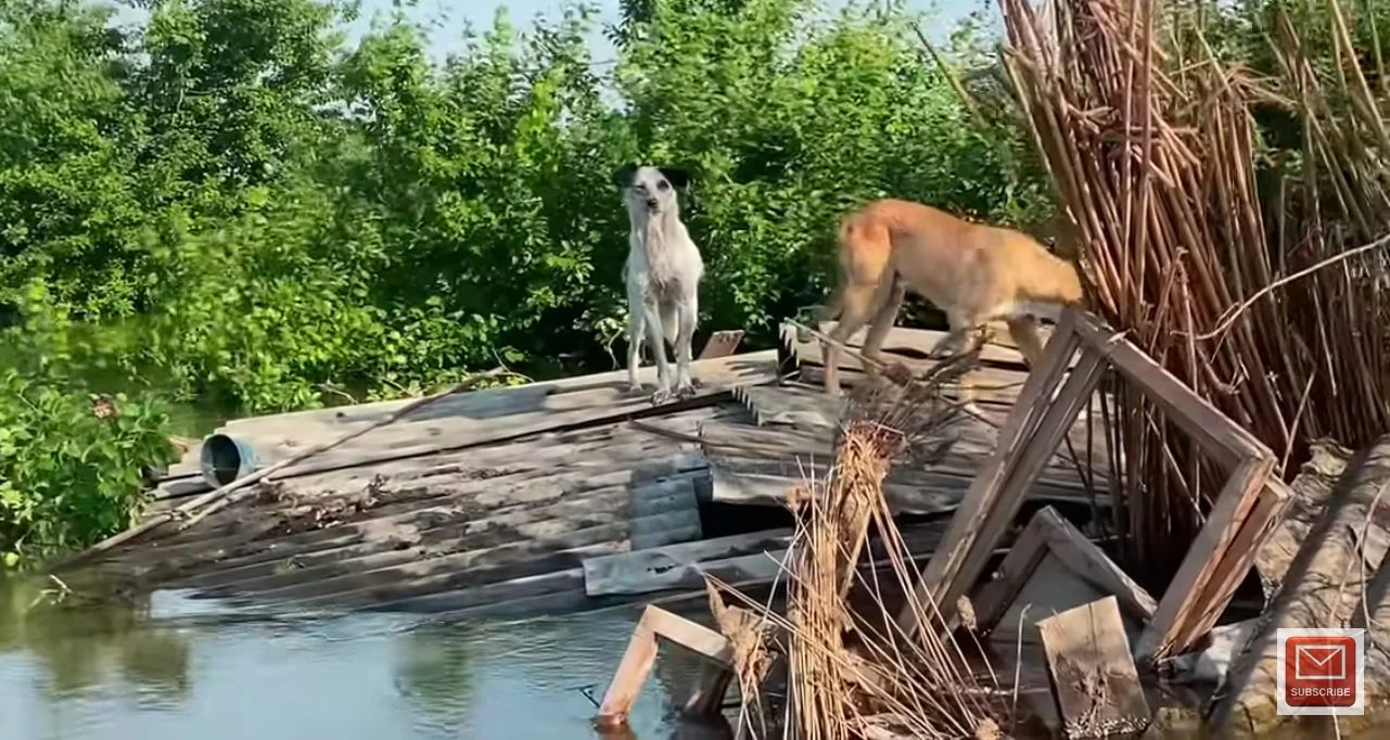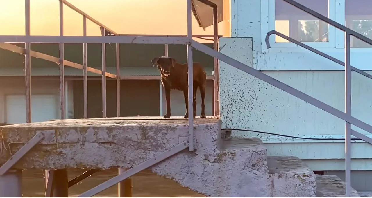 When floodwaters rushed through the region after the damโs destruction in the Ukraine, many homes were quickly submerged. One elderly dog managed to climb onto the roof of a partially flooded house.