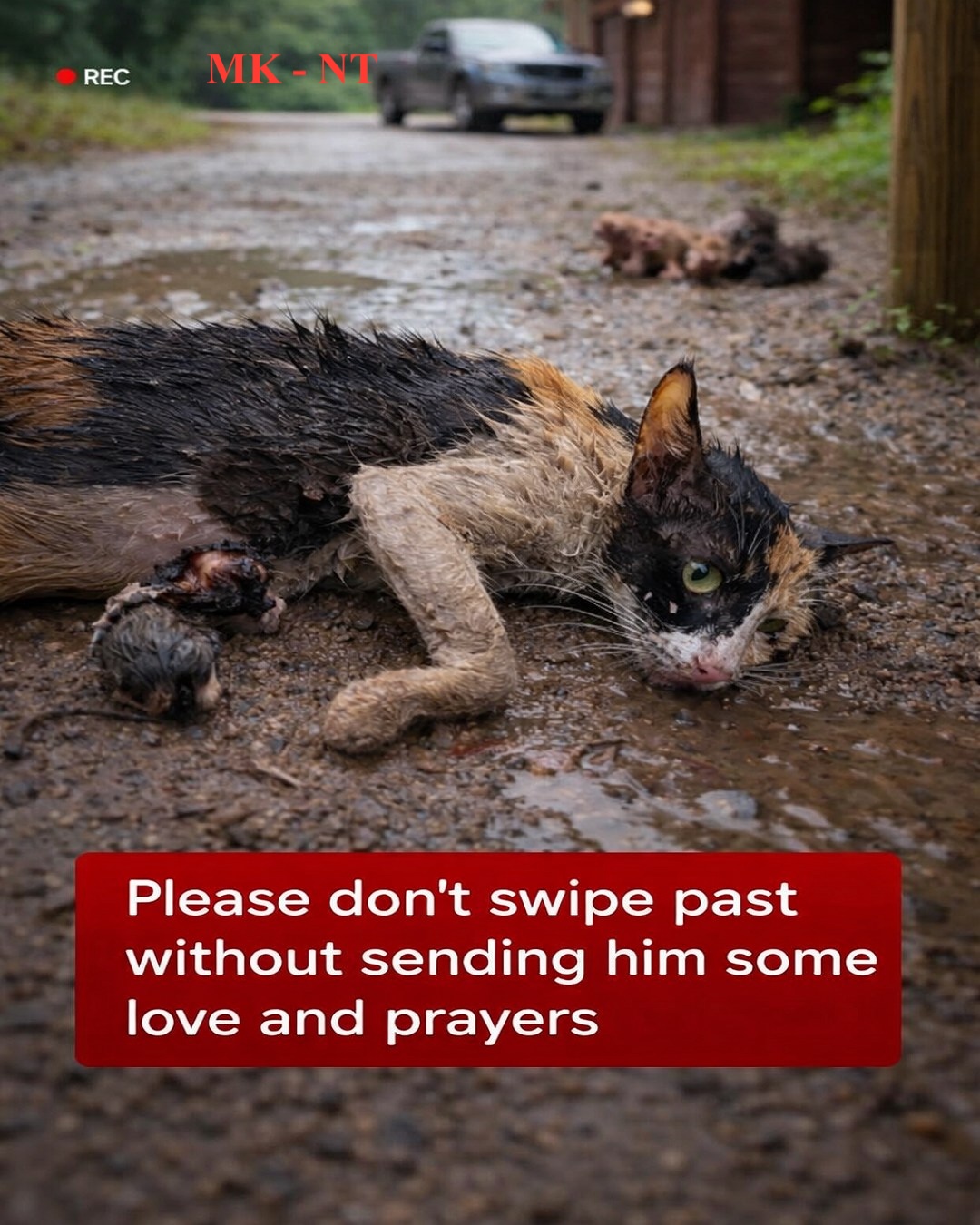 On a lonely, muddy road, a small cat lay helpless on the ground. 🐱💔