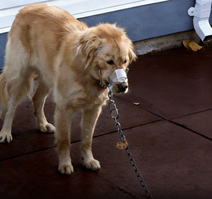 In the image, a golden-colored dog stands alone on a hard surface, a chain attached to its collar limiting how far it can move. But what draws immediate attention is something unusual and troubling placed over the dog’s snout — a small plastic cup covering its mouth. The cup appears to have been secured in a way that prevents the dog from opening its mouth properly.