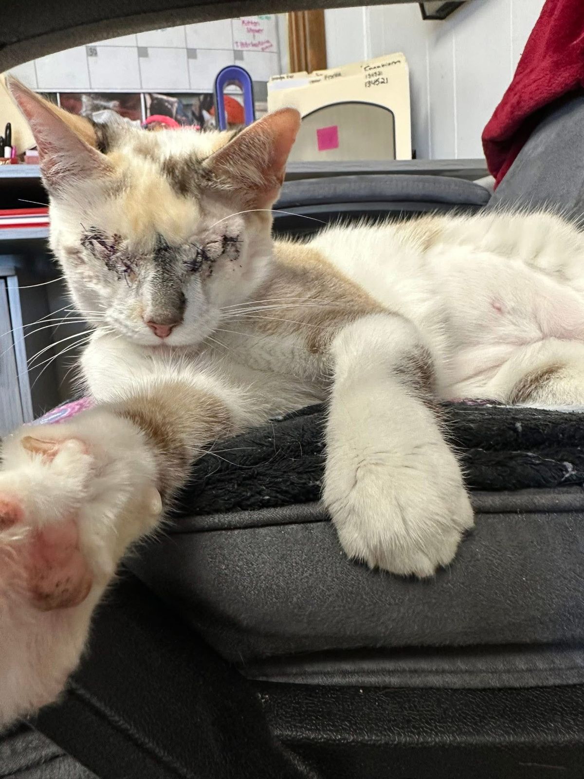 When rescuers first found him, his tiny body was covered in injuries. The area around his eyes was severely damaged, leaving both eyes permanently closed and stitched after emergency surgery.