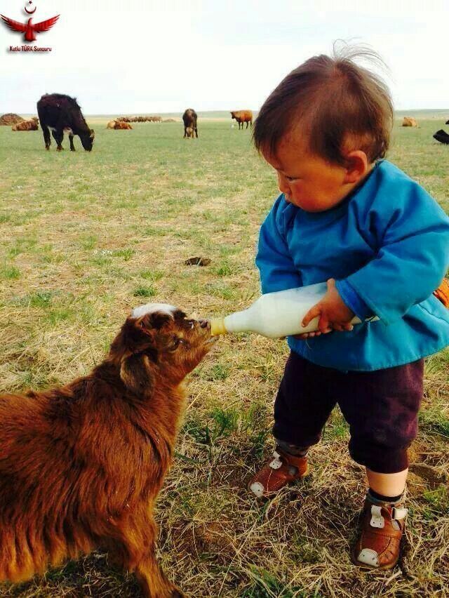 In the middle of a quiet open field, a tiny child carefully holds a milk bottle and gently feeds a hungry little goat. 🍼❤️