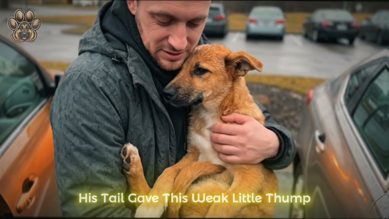 The story began when a man noticed a young dog sitting alone on the side of a rainy street. The puppy looked thin, wet, and frightened, quietly watching cars pass by without approaching anyone. A piece of bread lay nearby, but the puppy seemed too weak or unsure to eat it.