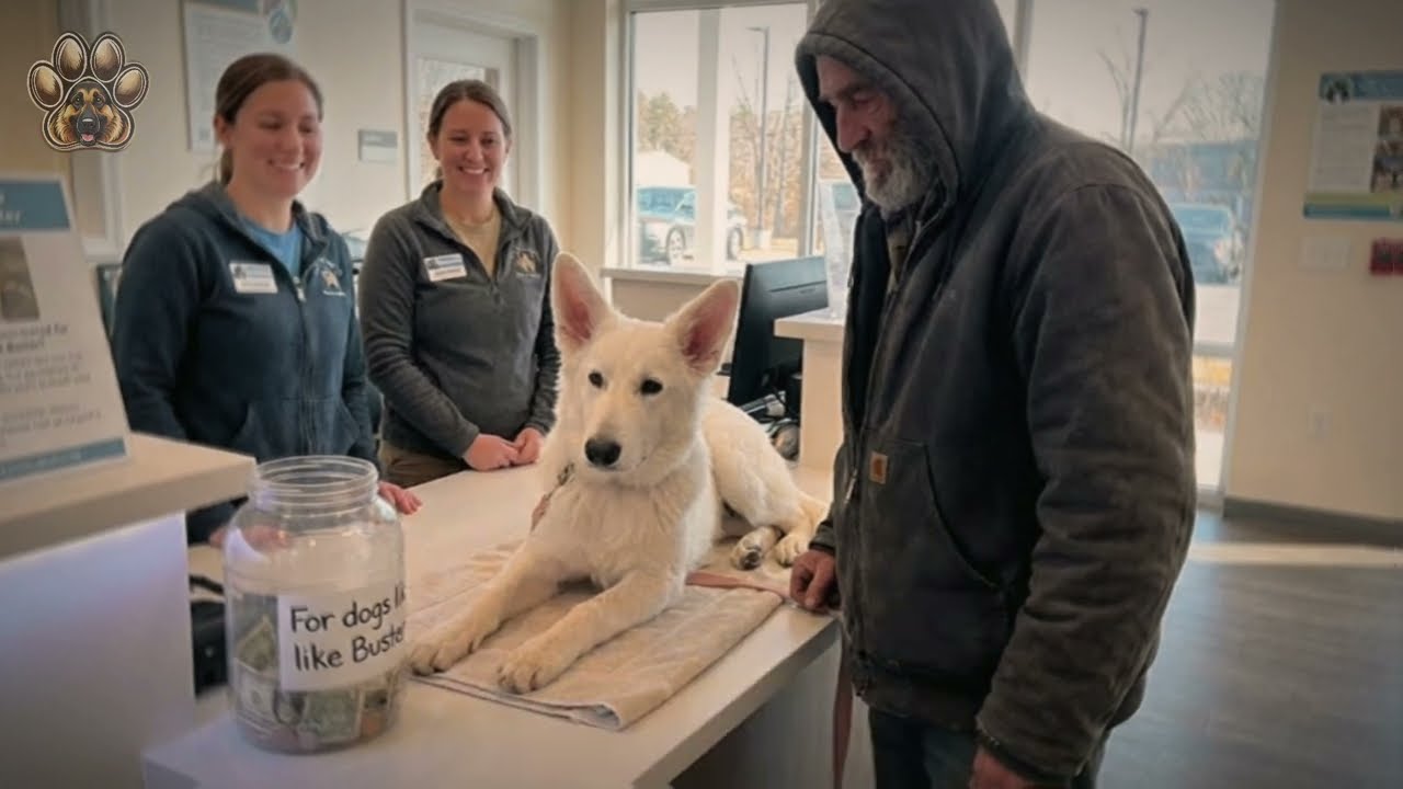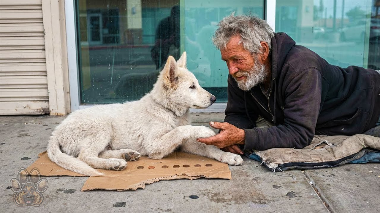 The man, who spends his days sitting on a piece of cardboard near a storefront window, owns very little. Beside him are a few coins—his last pennies for food or necessities. But he is rarely alone. Resting beside him is a white puppy who refuses to leave his side.
