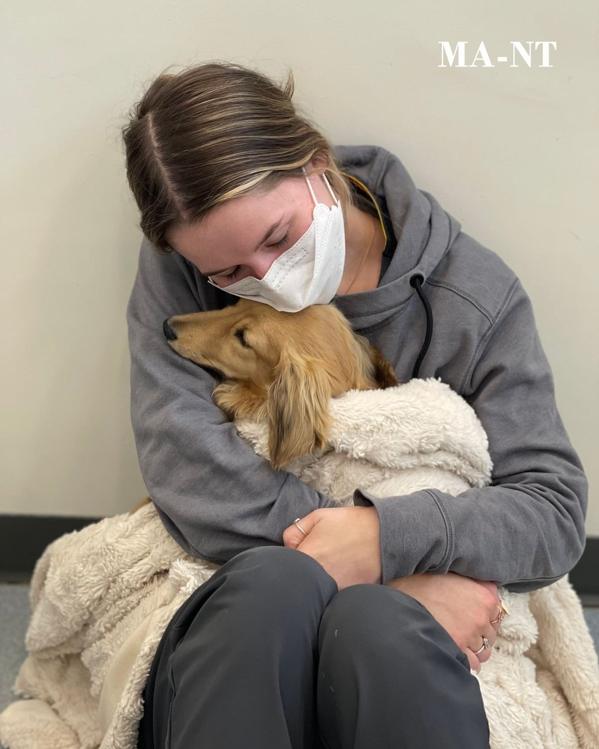 The dog rests peacefully in the woman’s arms, its eyes closed as if finally feeling secure. The caregiver, wearing a protective mask, leans down to hold the animal close, creating a quiet moment of reassurance. While veterinary medicine focuses on diagnosing and treating physical conditions, emotional care is equally important in helping animals recover.