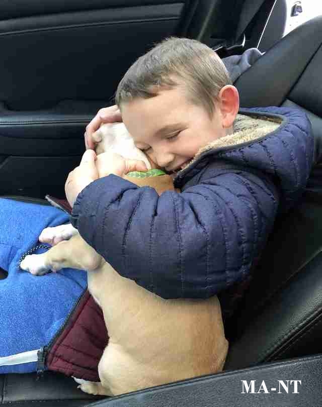 Few moments are as joyful as the day a child meets their new puppy. In one heartwarming scene, a young boy sits in the back seat of a car, wrapping his arms around a small puppy and holding it close with a smile on his face. The puppy rests calmly in his embrace, creating a touching moment that reflects the immediate bond that can form between children and animals.