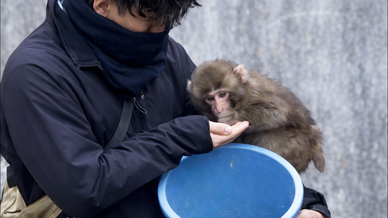 Meanwhile, the baby monkey resting in his arm adds another layer of tenderness to the scene. The tiny animal clings close, trusting the human who is protecting it.