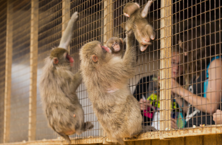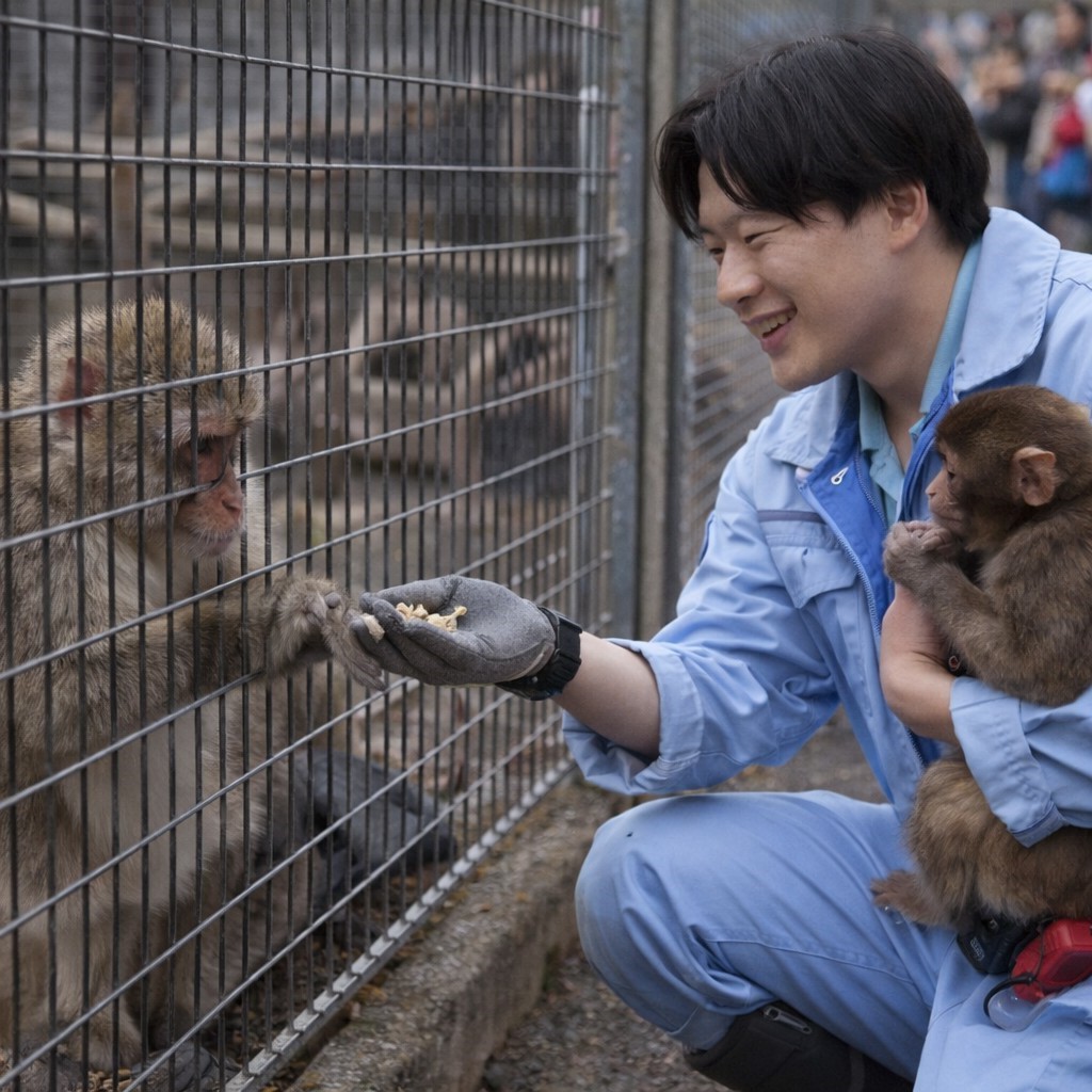 The caretaker’s smile and calm posture suggest familiarity. This is not the first time he has interacted with these animals. His gentle approach allows the monkey to feel safe enough to reach out and accept what he offers.
