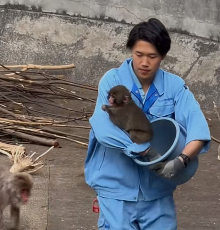 Meanwhile, the baby monkey resting in his arm adds another layer of tenderness to the scene. The tiny animal clings close, trusting the human who is protecting it.