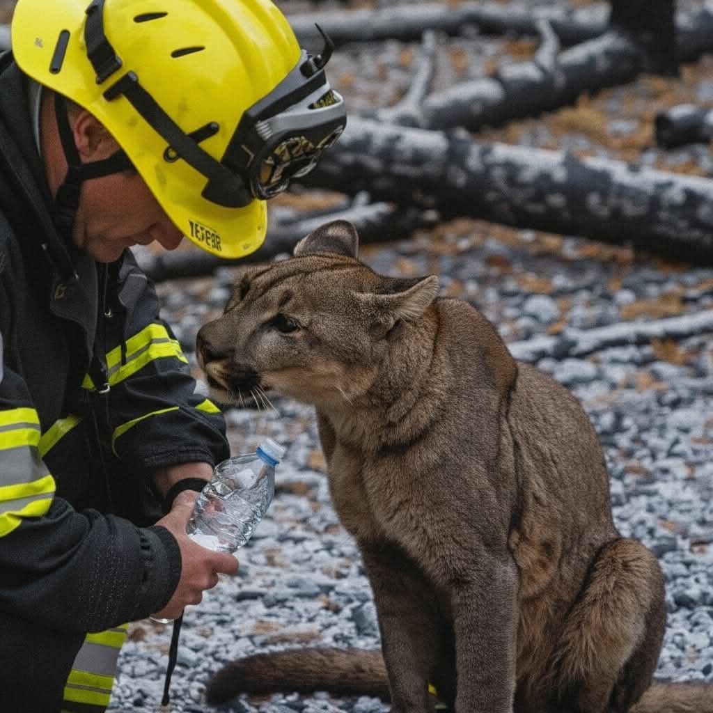 A Firefighter Shares Water With a Wild Cougar After a Devastating Forest Fire