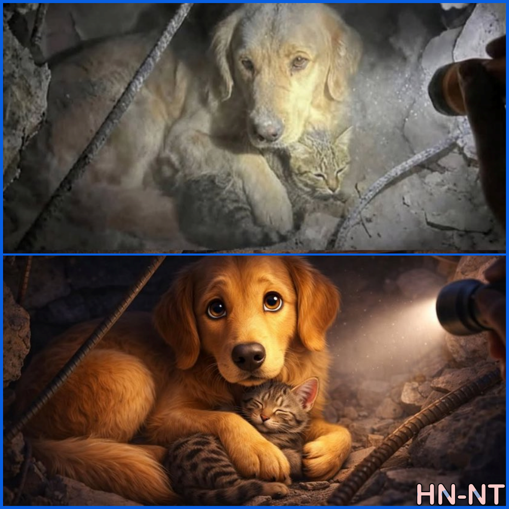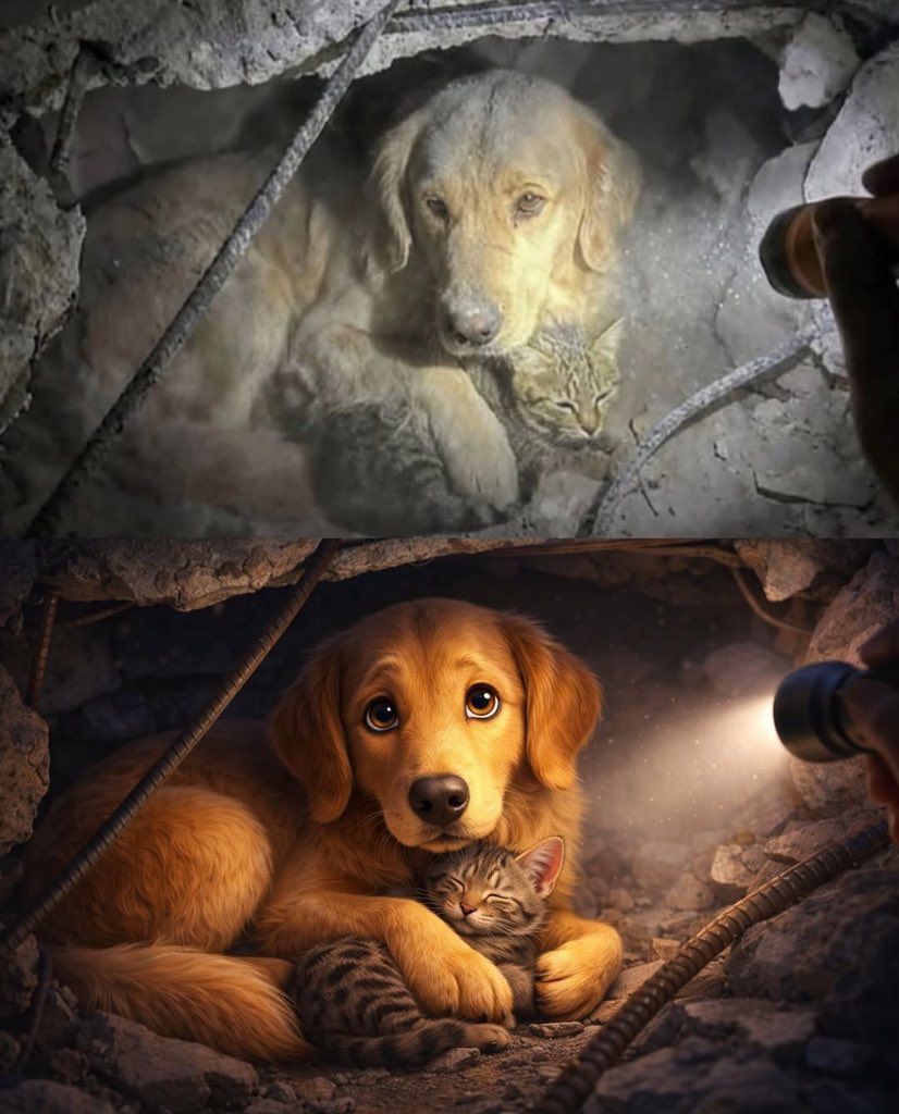 Tucked safely beneath his chest was the tiny kitten. The dog had curled his body around her, shielding her from the cold and the fear, keeping her warm while the world around them lay in ruins. 🐶🐱