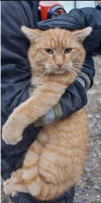 The cat appears calm but clings closely to the firefighter, its paws wrapped around his arm as if it understands that it has finally found safety. In stressful situations such as fires or accidents, animals can easily become trapped, confused, or terrified. Many pets instinctively hide in high places, rooftops, or trees, making rescue operations particularly challenging.