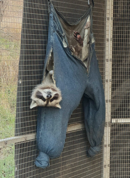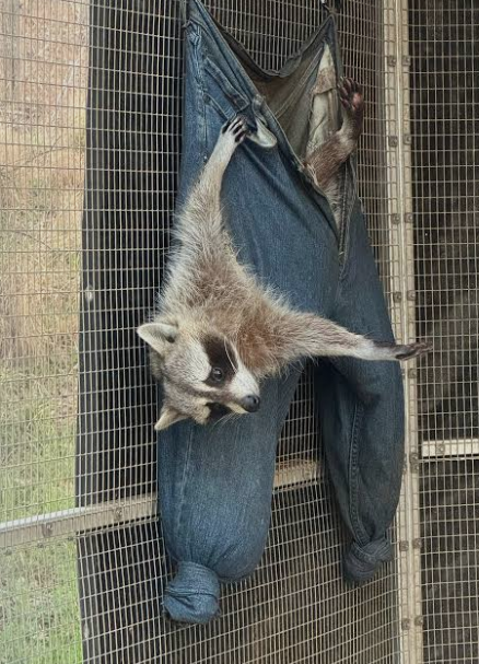 Someone had creatively repurposed the old jeans by tying the legs closed and hanging them up like fabric pouches. What started as a simple idea for animal enrichment quickly turned into the raccoon’s favorite place to relax. Instead of sleeping on the ground or in a typical bed, the raccoon curled up inside the hanging denim, using the soft fabric like a hammock. The material gently supported his body, and the slight swing of the hanging pants probably made the space feel even more secure.