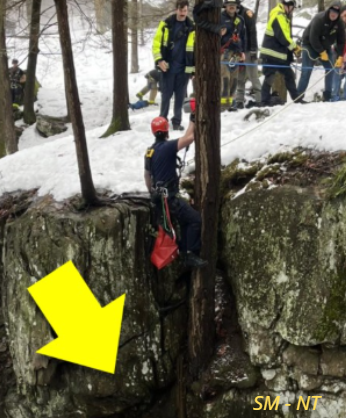 The large yellow arrow seen in the image highlights just how deep the crevice is, emphasizing the challenge rescuers faced in reaching the stranded dog.