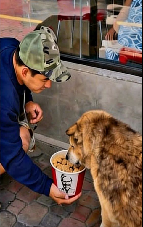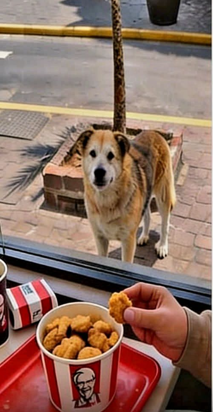 Standing quietly on the sidewalk was a stray dog. The dog wasn’t barking or causing a disturbance. Instead, it simply stood there, looking through the glass window toward the food inside.