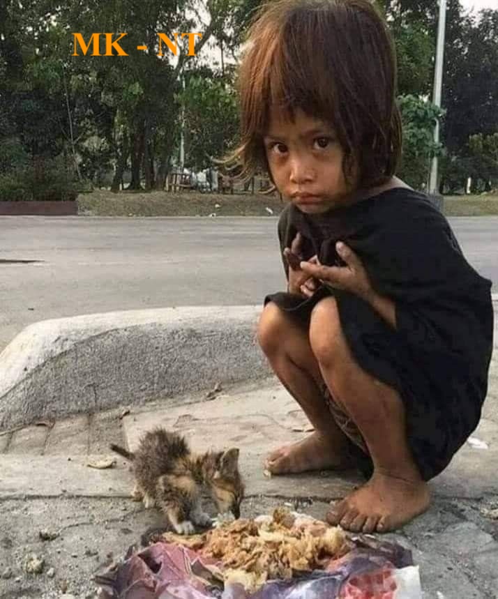 On the side of a quiet road, a little girl crouches beside a tiny hungry kitten. Her clothes are worn, her feet bare, and the food in front of her might be all she has for the day.