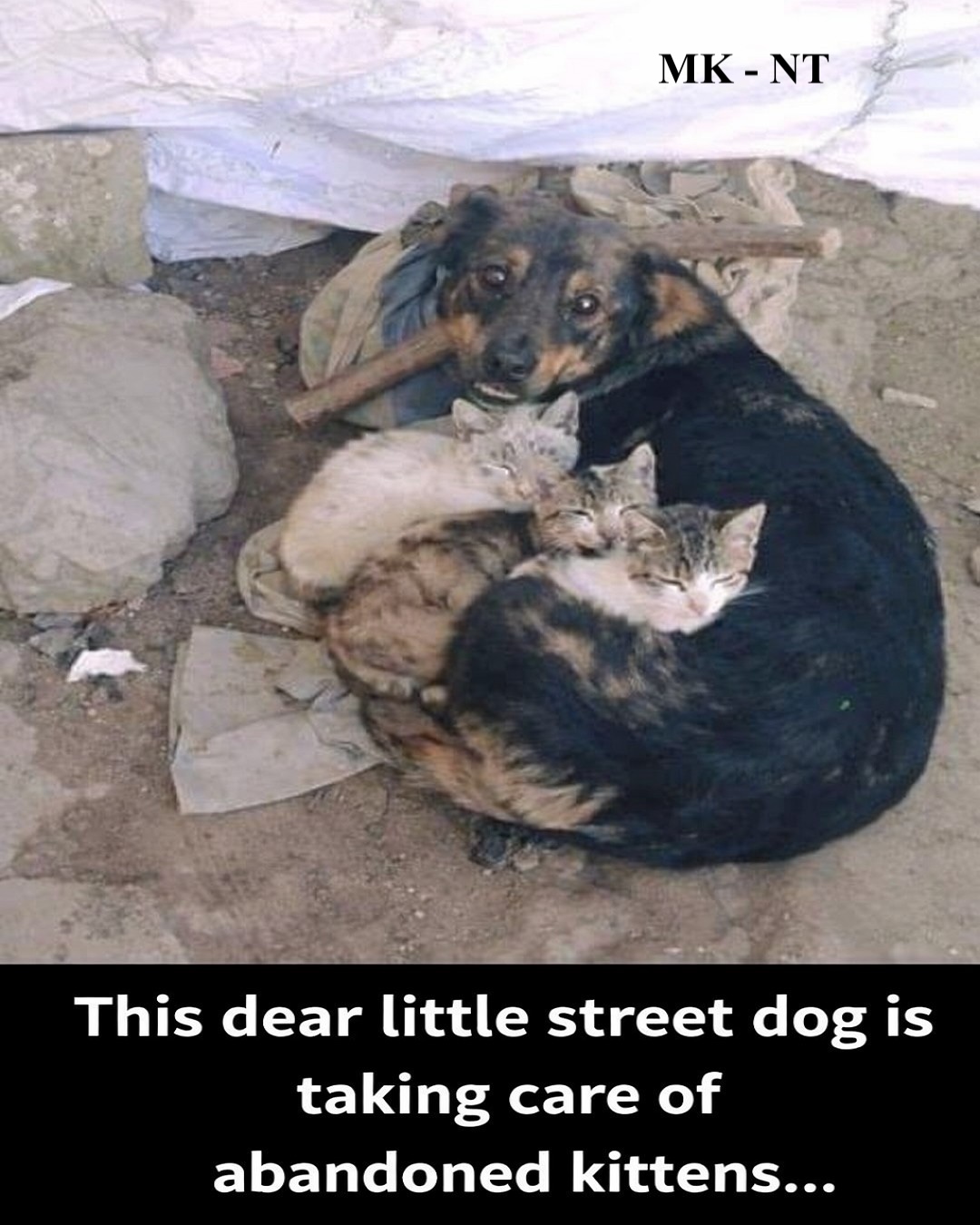 On a quiet, dusty street corner, a small stray dog was seen curled tightly around several tiny kittens. The little ones had been abandoned, left alone without their mother and far too young to survive on their own. Cold, hungry, and frightened, they huddled together, searching for warmth and safety. 💔