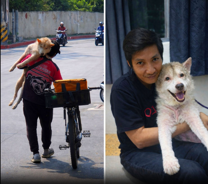Instead of rushing to finish deliveries, the rider walked slowly along the road, making sure the dog remained secure in his arms. For people passing by, the image was both surprising and heartwarming. Carrying a dog while walking a bicycle through a busy street is certainly not something you see every day.