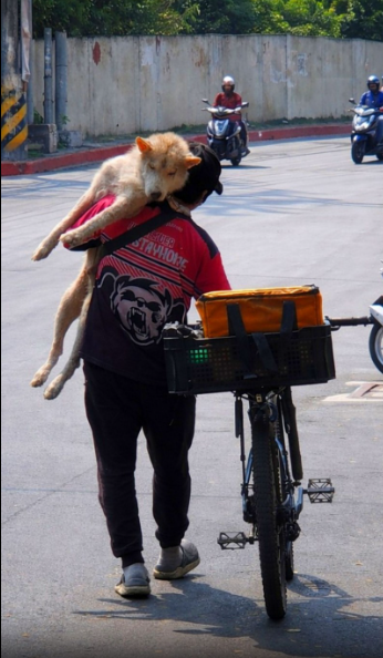 Instead of rushing to finish deliveries, the rider walked slowly along the road, making sure the dog remained secure in his arms. For people passing by, the image was both surprising and heartwarming. Carrying a dog while walking a bicycle through a busy street is certainly not something you see every day.