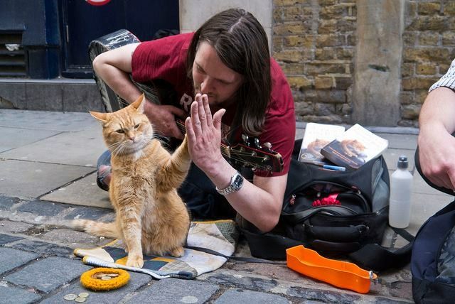 Next to the cat, a few small items lie on the ground — a notebook, a few coins, and personal belongings that suggest the musician may spend much of his time performing in the same spot.