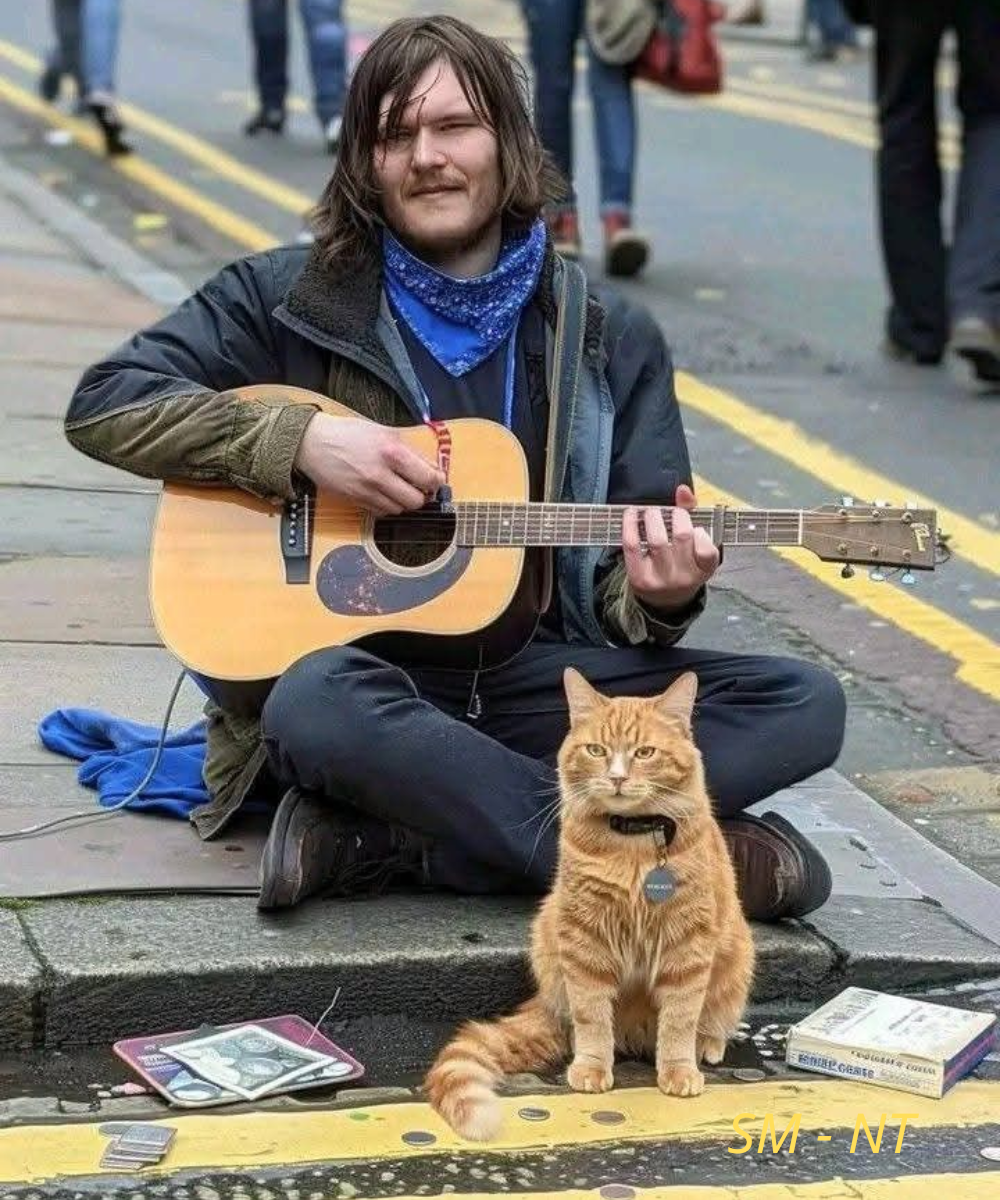 The cat’s presence transforms the performance into something more than just music. It becomes a quiet story about friendship and loyalty. For people passing by, the scene offers a small but meaningful reminder that companionship can appear in the most unexpected places.