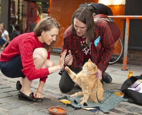 Next to the cat, a few small items lie on the ground — a notebook, a few coins, and personal belongings that suggest the musician may spend much of his time performing in the same spot.