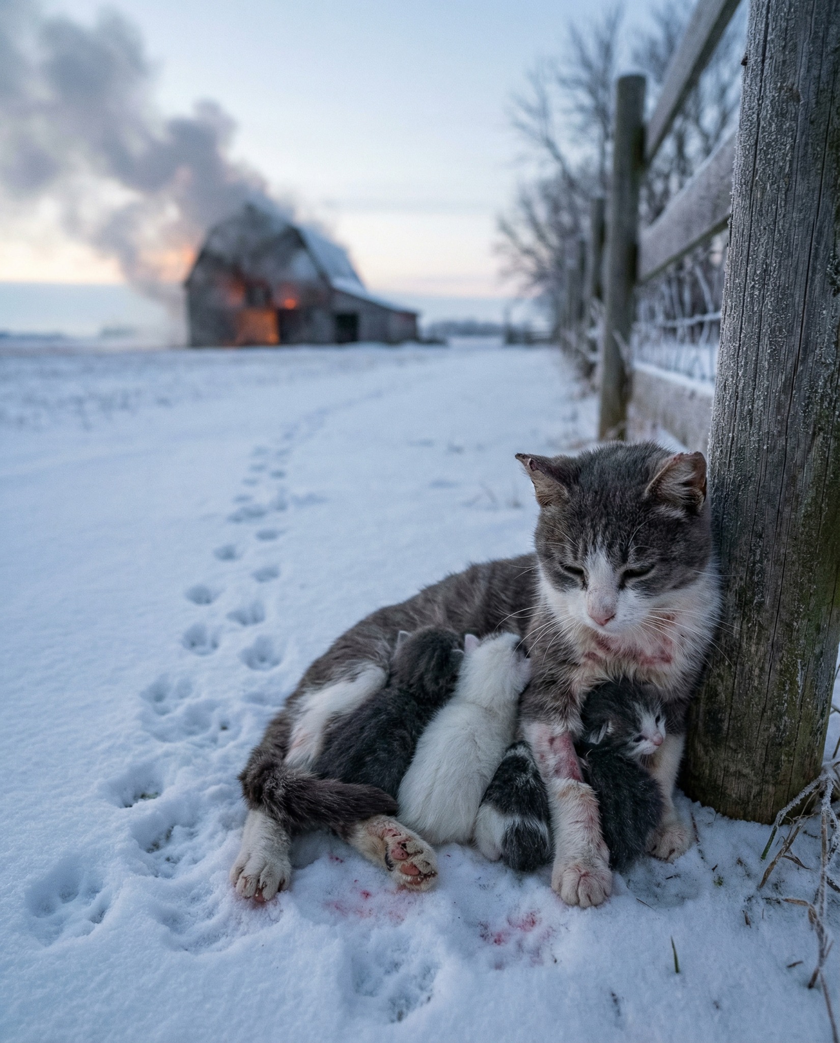 Four separate lines of paw prints leading from the burning barn to the fencepost. Each trail dotted with small, dark spots in the snow.