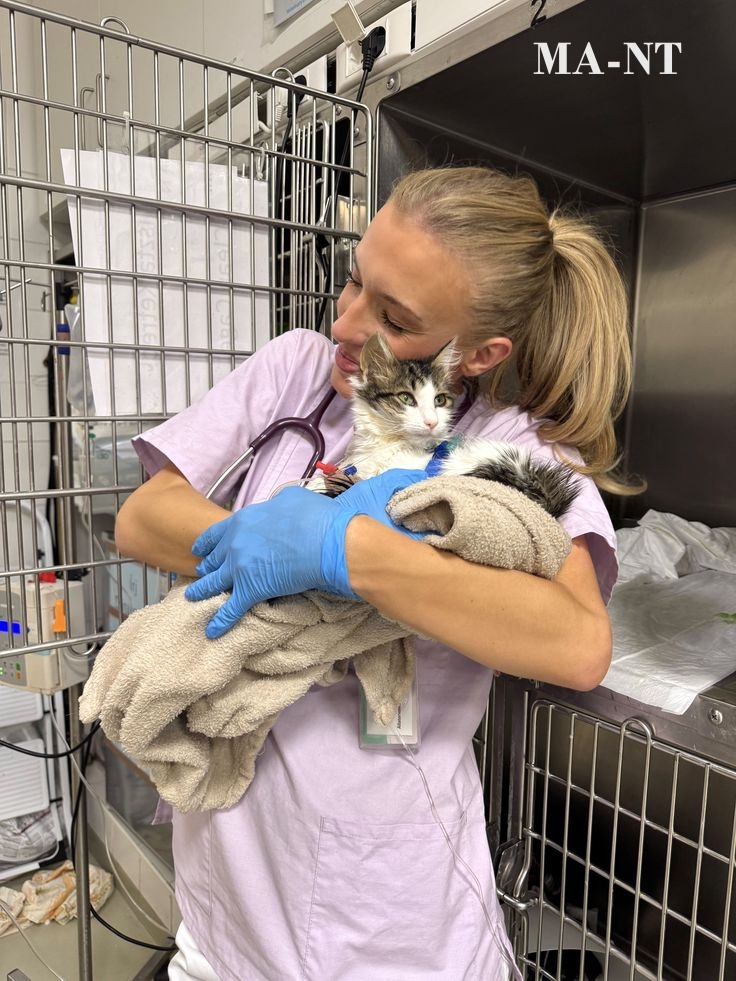 The kitten rests calmly in the caregiver’s arms while surrounded by the equipment and facilities used to monitor and care for animals in need. Veterinary professionals frequently encounter animals that arrive injured, sick, or frightened, and their role extends beyond providing medical treatment. Emotional reassurance is also an important part of helping animals recover.