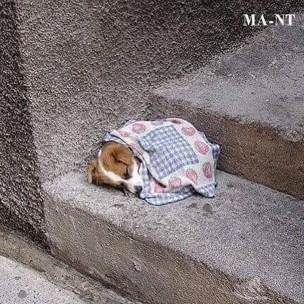 A small puppy wrapped in a thin blanket has captured attention after being spotted sleeping alone on a set of outdoor concrete steps. The touching image highlights the difficult reality faced by many stray and abandoned animals.