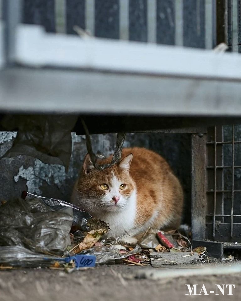 In many cities around the world, stray animals struggle daily to survive in difficult and often dangerous environments. One such example is a ginger-and-white cat recently seen hiding beneath a metal structure surrounded by trash and debris.