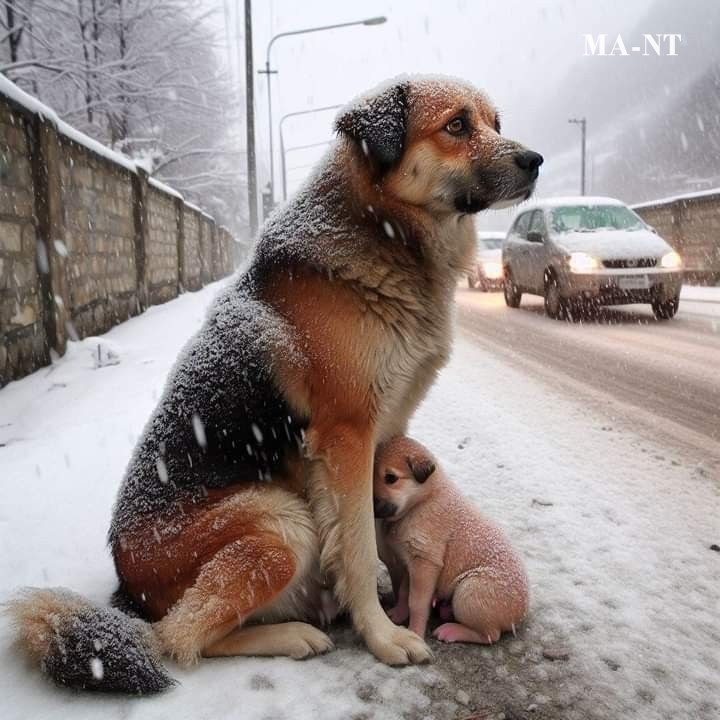 The setting is a cold winter street where cars continue to pass by, while snow gathers on the dog’s fur. Despite the harsh weather conditions, the dog remains seated, allowing the piglet to stay close for protection from the cold.