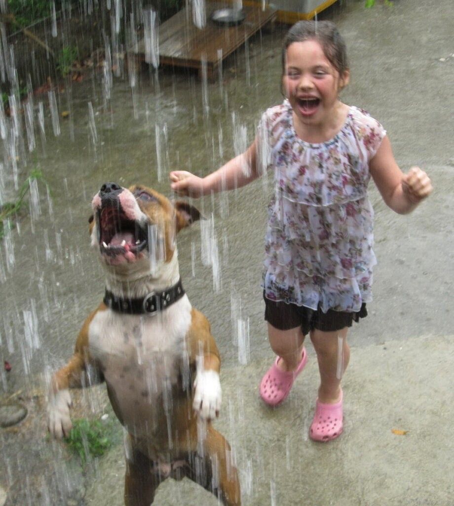 As the rain poured down, a little girl laughed with pure joy while her dog jumped beside her, barking happily into the falling water. ☔🐾