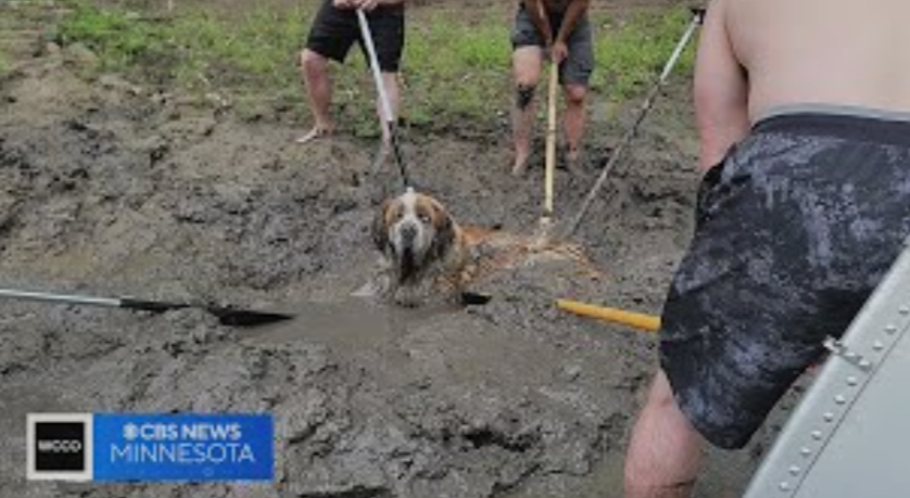 A dramatic rescue scene captured on camera is gaining attention online after a group of people worked together to save a dog trapped in deep mud.