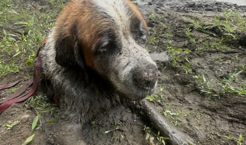 The incident occurred in what appears to be a muddy field or swamp-like area where the dog had somehow become stuck. According to those present, the animal had sunk so deeply into the thick mud that only its head and part of its neck were visible above the surface.