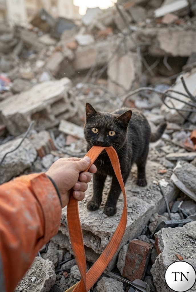 While walking through piles of shattered concrete and dust, he suddenly felt a gentle tug on his jacket. When he lowered his camera, he saw a dusty black cat lightly biting his sleeve—not to hurt him, but to get his attention.