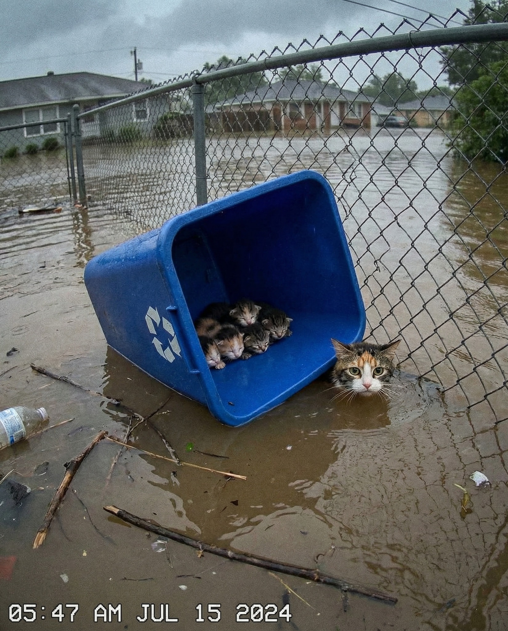 In the middle of the flooded area, a heartbreaking yet powerful scene appeared. A small blue recycling bin floated near a fence, and inside it were several tiny kittens huddled together, trying to stay warm and dry.
