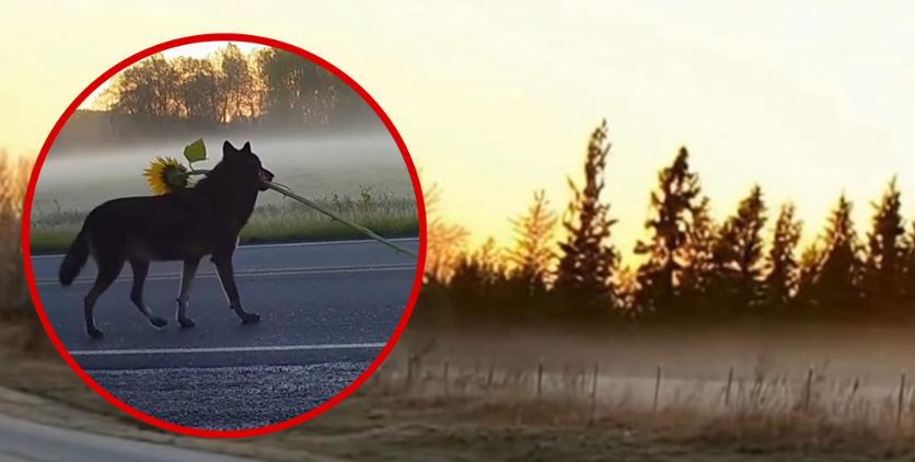 Dogs are well known for carrying things they find—sticks, toys, or sometimes random objects they discover along the way. But seeing one walk down an empty road with a sunflower creates a completely different feeling.